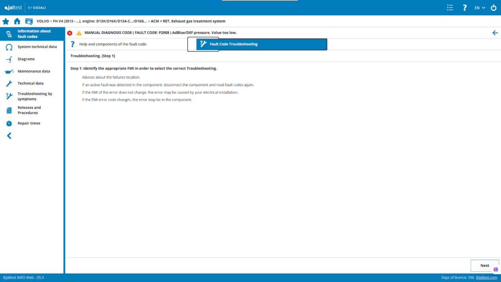 Jaltest INFO Web provides all the tools and technical information needed for a VOLVO FH P20E8 fault diagnosis, helping identify the root cause accurately.